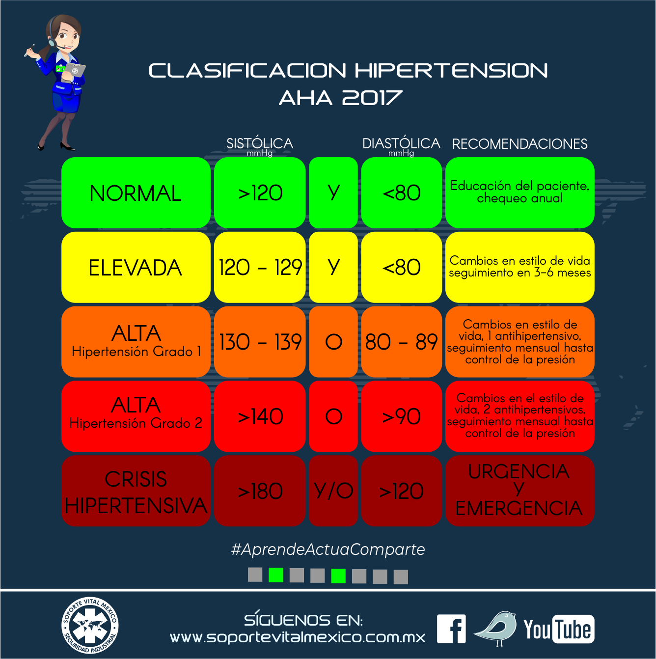 El American College of Cardiology (ACC) y la American Heart Association (AHA) ha publicado recientemente la guía para la prevención, detección, evaluación y tratamiento de la hipertensión arterial (HTA) en adultos. El punto más controvertido es el umbral diagnóstico de 130/80 mmHg, lo cual conlleva diagnosticar HTA en un gran número de personas previamente consideradas no hipertensas. La presión arterial (PA) se clasifica como normal (sistólica < 120 y diastólica 80 mmHg), elevada (120-129 y <80 mmHg), grado 1 (130-139 o 80-89 mmHg) y grado 2 (≥140 o ≥90 mmHg).