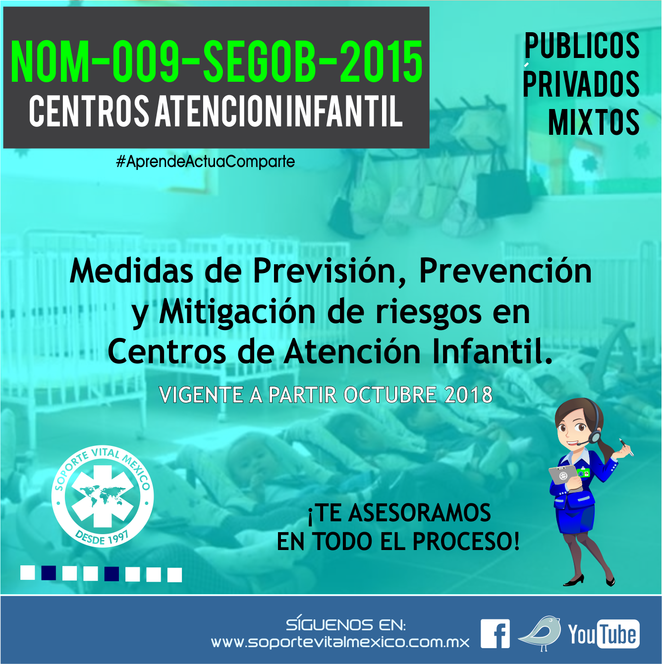 Con la entrada en vigor de la NOM-009-SEGOB-2015 en Octubre de 2018, deberán regularizarse todas las Guarderias y/o Estancias Infantiles (Centros de Atención Infantil) en el país, con respecto a su operación, equipamiento y su organización para prevenir y enfrentar cualquier situación de emergencia dentro de los mismos.